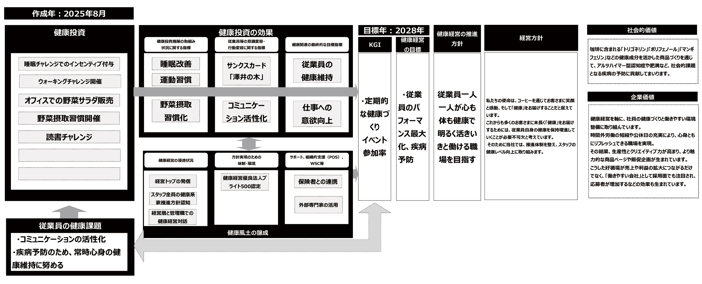 「株式会社澤井珈琲は従業員一人ひとりが心も体も健康で、明るく活き活きと働ける職場を目指して、従業員の健康維持を積極的にサポートすることを宣言します。」