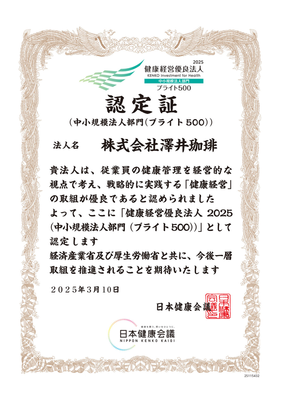 「株式会社澤井珈琲は従業員一人ひとりが心も体も健康で、明るく活き活きと働ける職場を目指して、従業員の健康維持を積極的にサポートすることを宣言します。」